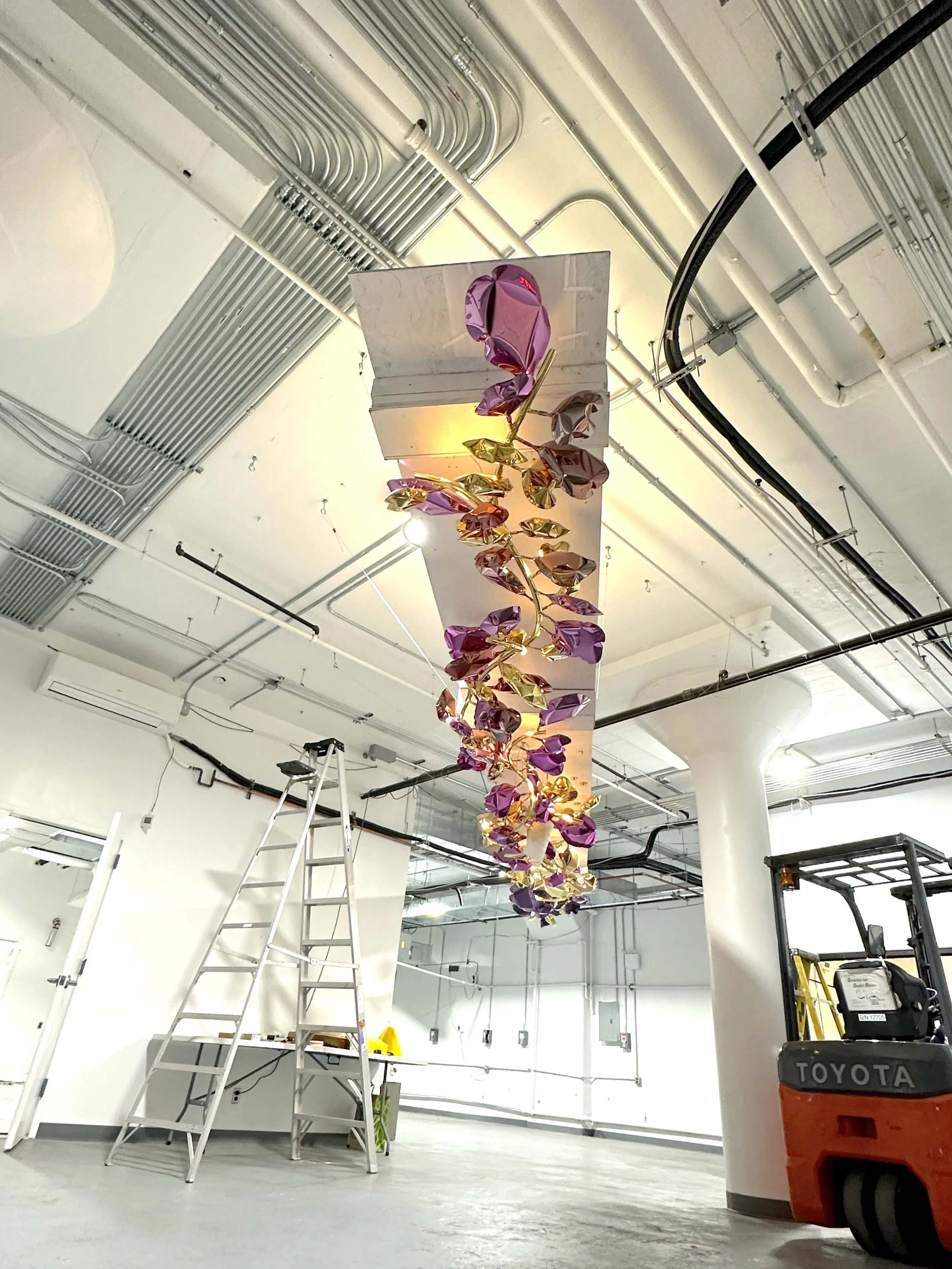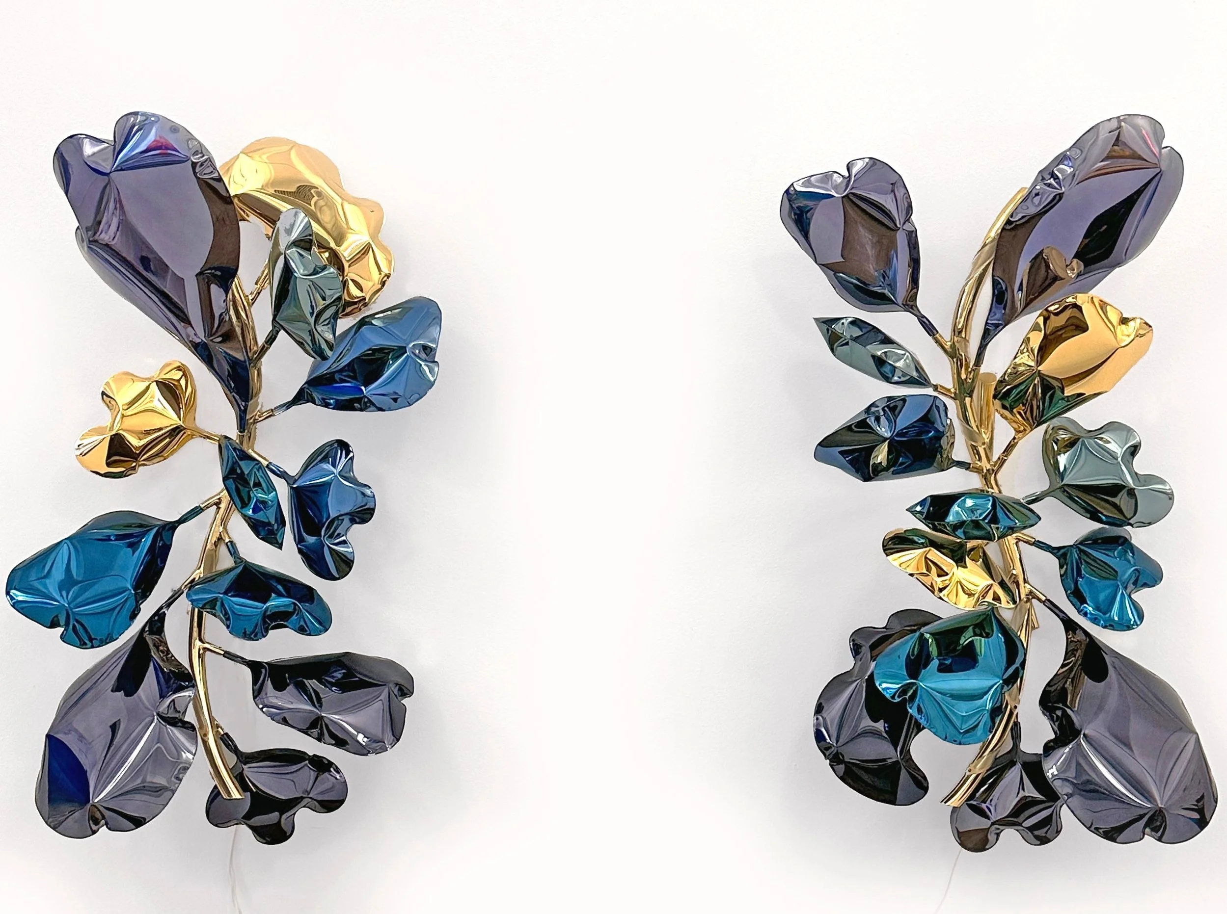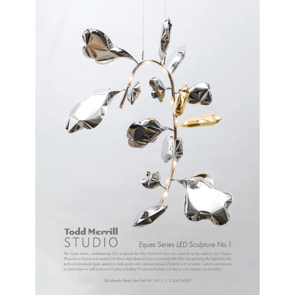 The 'Eques' series LED light sculptures explore the mystery and wonder of nature. Inspired by the unique Leafy Sea Dragon (Phycodurus Eques), the sculptures’ buoyant elements are made from air inflated metal ‘plumes’ that create a material metamorphosis whereby metal takes on the appearance of glass. Offered in a bespoke arrangement of high polished mirror stainless steel, plated 24KT Gold, Rose Gold, and custom painted colors. The works appear to float and defy gravity, while creating abstract reflections within the environment.