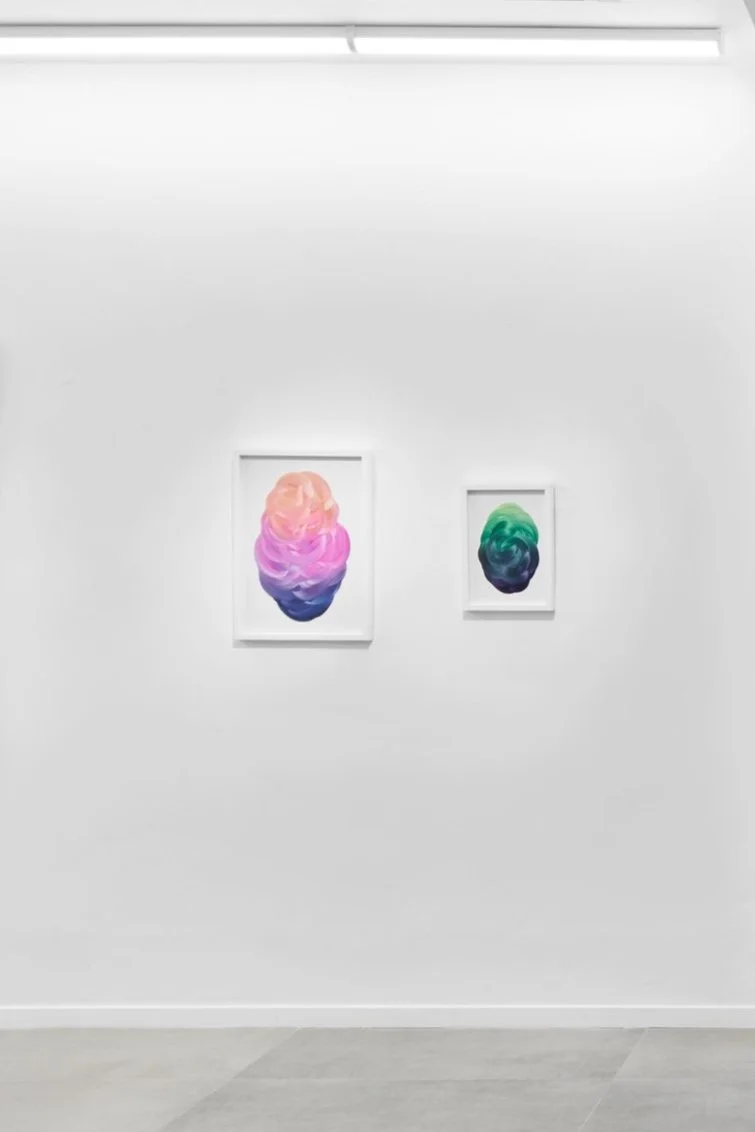 Atmospheric color fields in the shape of a 'dream' fold and unfold space. Swooshing fluid acrylic paint is applied in a rhythmic manner suggesting a nest, or hive like form. Fluttering brushstrokes act as synaptic connections transferring electrical pulses from one hemisphere to the other. The organic form also references an egg, and combined with the color genesis of the paint itself, color field abstraction is pushed into a geometric representation of fertility.