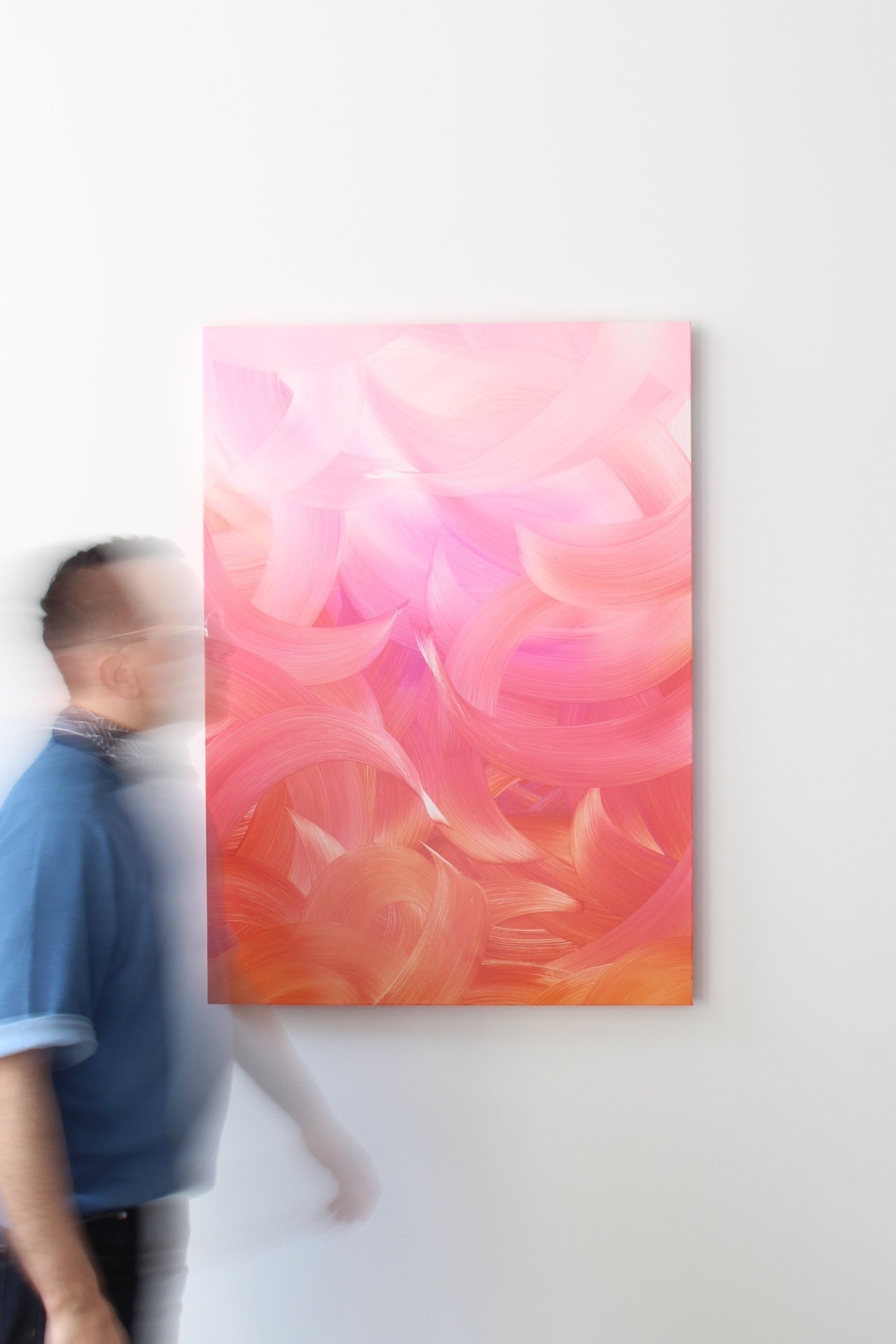 Working under a trance like state, both paint and surface exchange energy in which the artist tries to achieve a sublime moment of ‘lift’ by allowing materials to have an expression of their own. Paint and process reveal a dynamic spatial quality from the painting surface that remains exposed. By applying various gestures of hand pressure, the brushstrokes create multiple levels of translucency providing a sense of bouyancy, levitation and incandescence. Color combinations act like DNA sequences that are 'set off' while painting. These create chain reactions of atmospheric abstraction that are romantic odes to the Light and Space Movement.